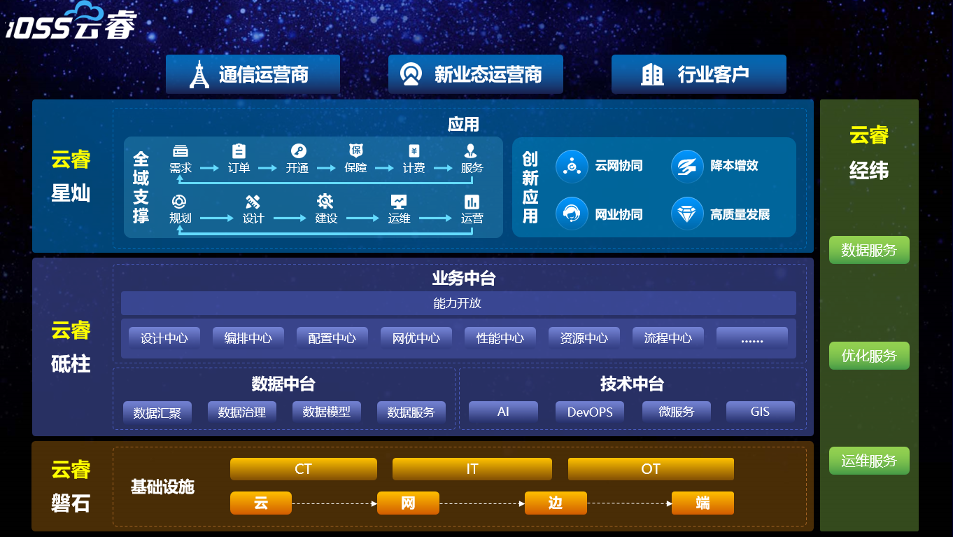 Ebpay创新iOSS云睿包括4大方向,涵盖通信运营商所需要的核心场景和能力:云睿磐石、云睿砥柱、云睿星灿、云睿经纬。
