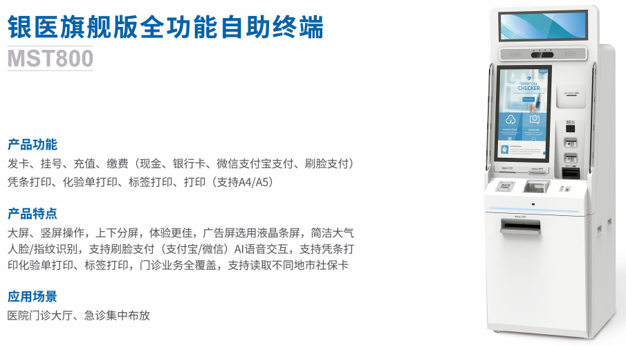 MST800全功能自助发卡终端采用全新设计、市面较流行的竖屏操作方式,上下分屏,体验更佳,广告屏选用液晶条屏,简洁大气。支持刷脸支付,AI语音交互,支持凭条打印,化验单打印,门诊业务全覆盖,支持读取不同地市社保卡。
